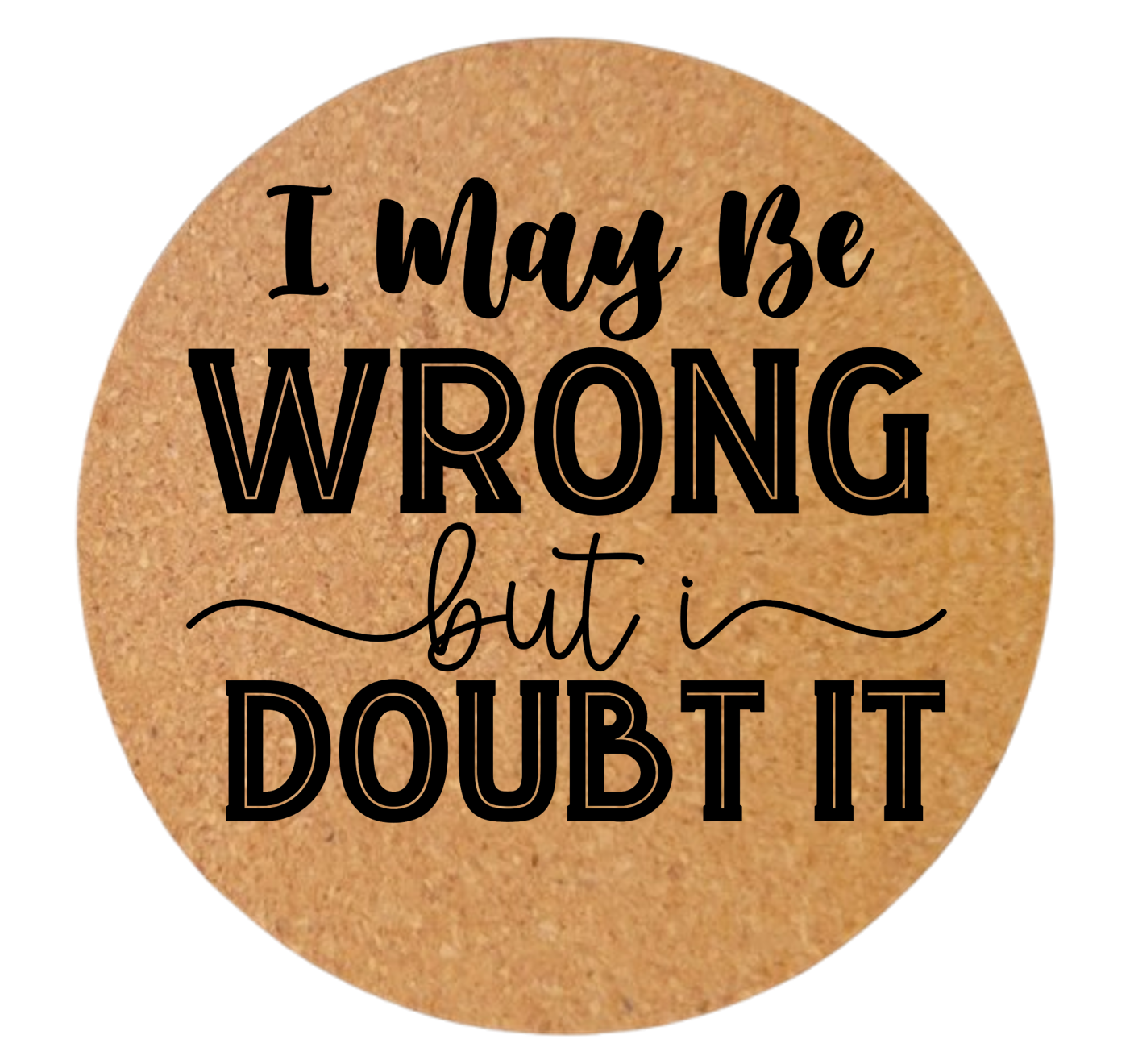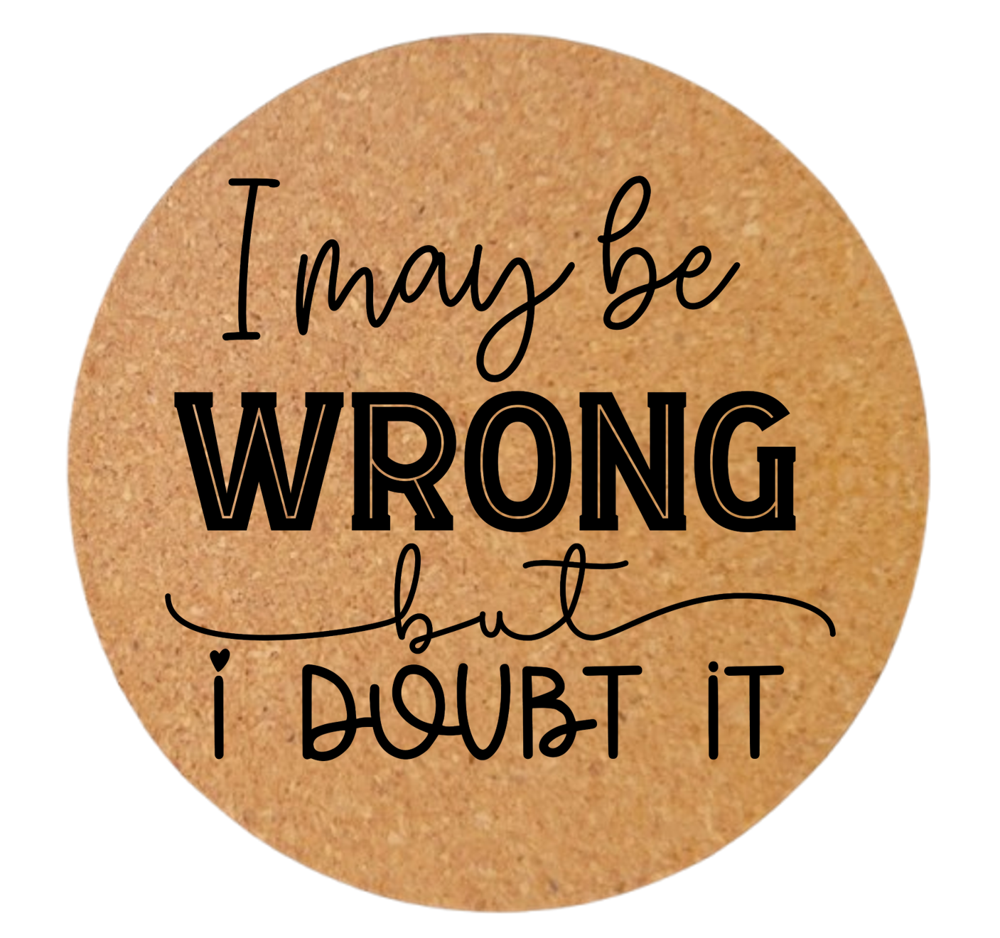 OUR COLLECTION OF I MAY BE WRONG COASTERS IN ACACIA, CORK, AND SLATE